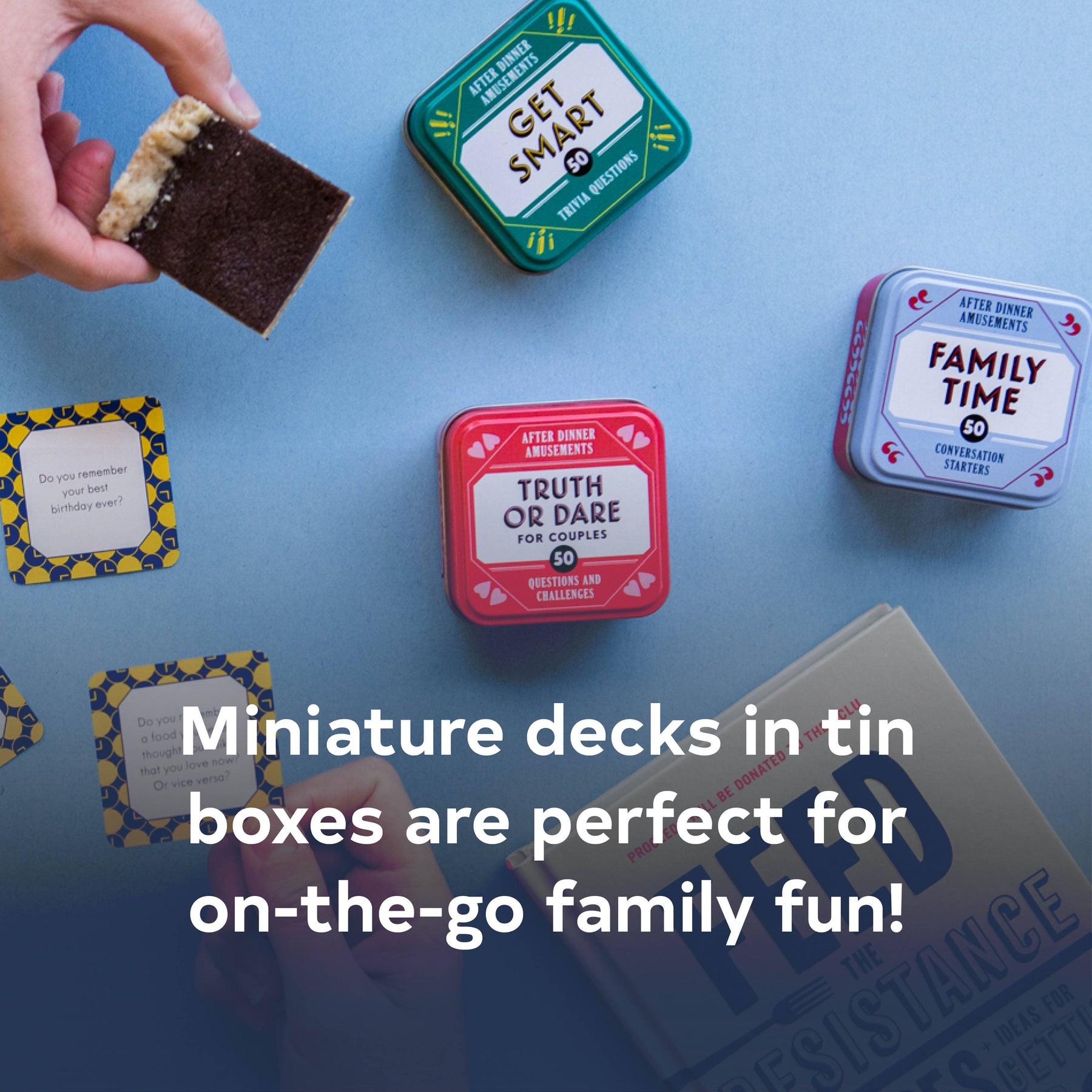 What's the perfect boredom buster for any occasion, be it a cozy night at home or a long family road trip? A riddle! And this irresistible little tin contains 50 of them. • tin box with lift-off lid: 2-1/4" x 2-1/4" x 1-1/4" • 51 cards: 2" x 2" • full-color throughout • for 2 or more players