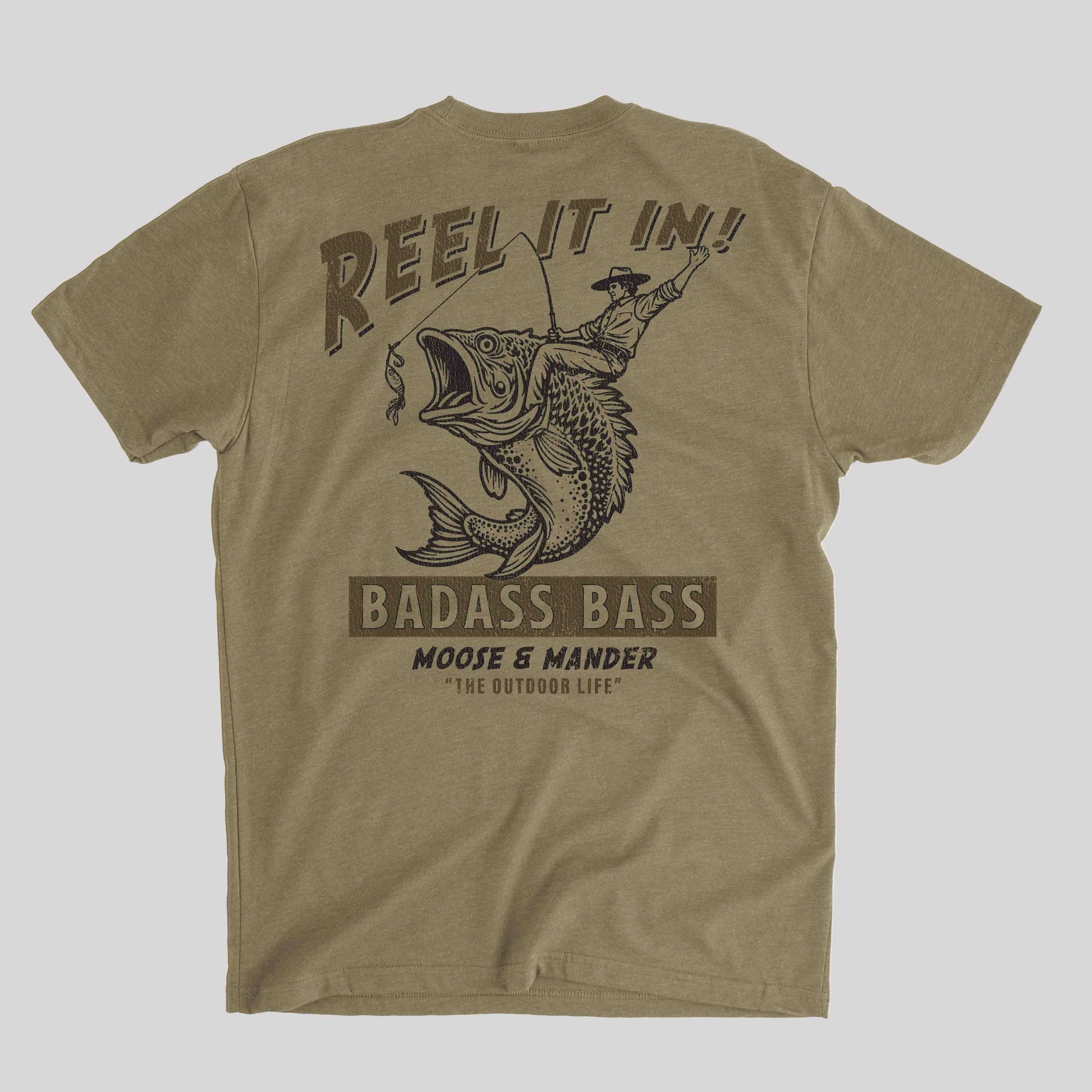Statement Piece: “REEL IT IN! BADASS BASS – Moose & Wander, The Outdoor Life” graphic on the back.